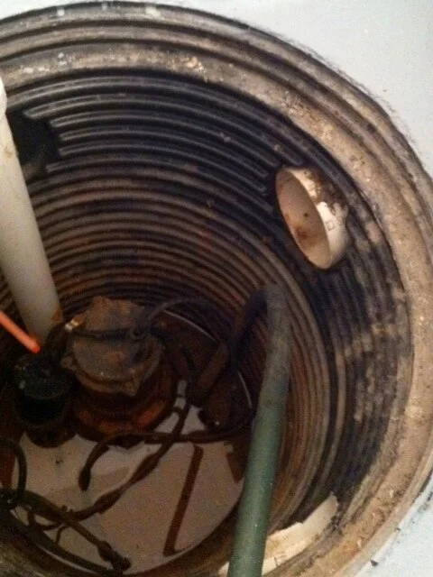 Here are two French drain systems that are commonly installed nowadays. On the left, Polyethylene pipe (PE) enters the pit, rather shallow, inches from the top of the floor. This tells you the pipe is not pitched. It is level throughout the perimeter of the basement if it enters the sump (the lowest part of the French drain) only inches from the floor level. On the right, PVC pipe enters the pit much lower and has a downward slant to it indicating the PVC pipe was pitched as it made its way around the basement to the sump. Arid Basement Waterproofing installs their systems like the one on the right, using PVC pipe and pitching the pipe to the sump.