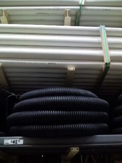 The second difference is the pipe used in the trench. There are 2 main materials used in the New Jersey/New York area: PVC (poly vinyl chloride) or PE (polyethylene). PE also goes by its brand name: ADS pipe (Advanced Drainage Systems). PVC pipe is used by practically all plumbers today in new and old houses. It's non-biodegradable and very rigid so when you use it to go around the perimeter of a house, you have to use elbows to go around corners. You also need to male-female connect the pipes because they come in 10 foot lengths. These two factors make PVC pipe less desirable for companies to use because it's more of a pain in the neck to work with and it's more expensive (double the price per foot and you have to pay for each elbow used). PE pipe comes coiled up in 100 foot rolls (no elbows or connections needed).