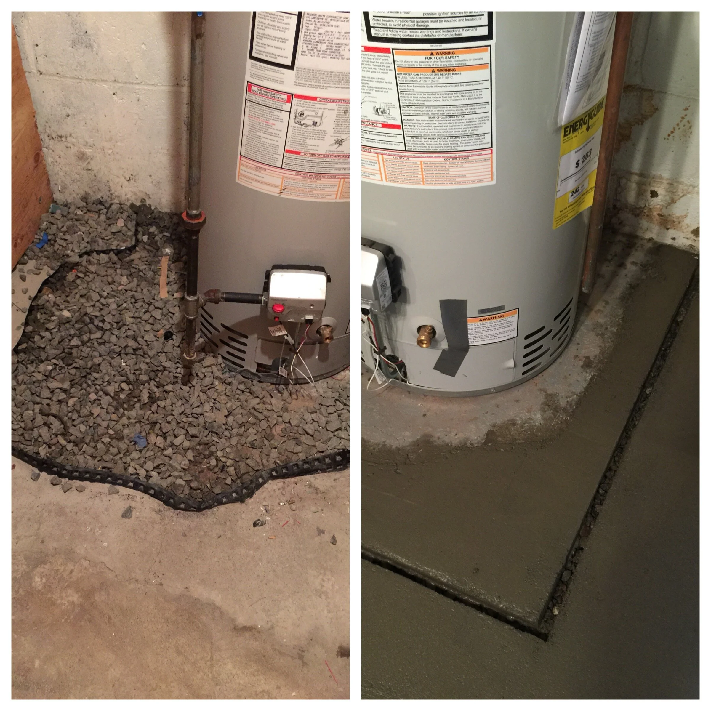 When installing French drains, and you have a water heater in the way, the customer could remove it temporarily or we can go around it. Here are two examples of going around the heater. On the left is one way of doing it. On the right, is how Arid goes around the water heater, nice and neat. We leave the 1" gap around it so that if water seeps in behind the water heater, it'll trickle into our gap without spilling into the rest of the basement. In addition, if the water heater ever leaks, that too, will drain into our gap and prevent a flood in your basement.